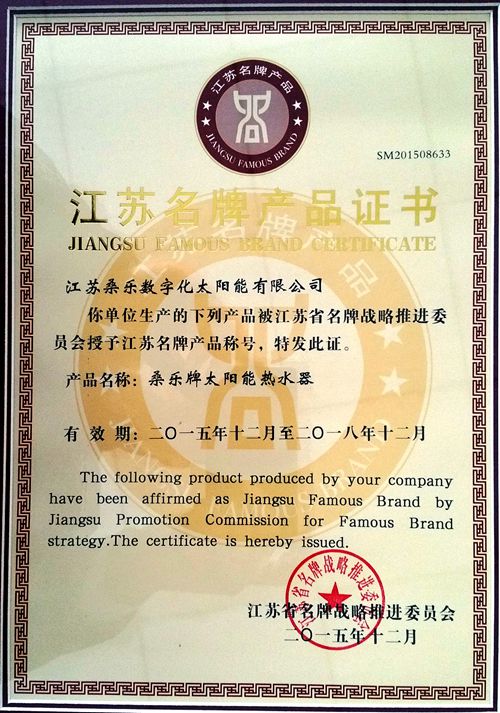 江蘇名牌是江蘇省委、省政府為促進(jìn)經(jīng)濟(jì)發(fā)展的戰(zhàn)略部署,對(duì)參選企業(yè)的質(zhì)量管理、產(chǎn)品服務(wù)、市場(chǎng)占有率等方面進(jìn)行嚴(yán)格審查。作為全國領(lǐng)先的太陽能熱水器生產(chǎn)企業(yè),公司秉承產(chǎn)品質(zhì)量就是產(chǎn)品生命的理念,建立實(shí)施了嚴(yán)格健全的質(zhì)量管理體系,用優(yōu)質(zhì)的產(chǎn)品質(zhì)量為創(chuàng)建名牌產(chǎn)品夯實(shí)了基礎(chǔ)。