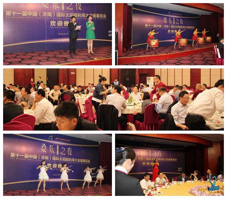 會(huì)展期間,以“桑樂(lè)之夜”為主題的太陽(yáng)能利用大會(huì)答謝晚宴在舜耕山莊舉行,濟(jì)南市政府相關(guān)領(lǐng)導(dǎo)、太陽(yáng)能行業(yè)協(xié)會(huì)領(lǐng)導(dǎo)、來(lái)自老拗的國(guó)際嘉賓以及200余客商參加了晚宴。