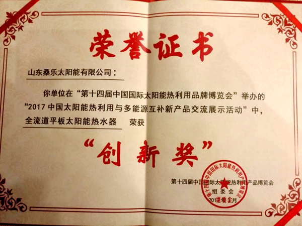 2017中國(guó)太陽(yáng)能熱利用與多能源互補(bǔ)新產(chǎn)品交流展示活動(dòng)頒獎(jiǎng)盛典盛大舉行,桑樂(lè)集團(tuán)在第十四屆中國(guó)國(guó)際太陽(yáng)能熱利用產(chǎn)品博覽會(huì)上獲得“創(chuàng)新獎(jiǎng)”。隨著社會(huì)發(fā)展和人民生活改善,特別是進(jìn)入新常態(tài)以來(lái),創(chuàng)新被國(guó)家確立為五大發(fā)展理念之首,國(guó)家和社會(huì)對(duì)太陽(yáng)能熱利用行業(yè)提出了“鞏固擴(kuò)大太陽(yáng)能熱水市場(chǎng),推動(dòng)供暖和工農(nóng)業(yè)熱水等領(lǐng)域的規(guī)?;瘧?yīng)用,拓展制冷、季節(jié)性?xún)?chǔ)熱等新興市場(chǎng),形成多元化的市場(chǎng)格局”的更高要求,太陽(yáng)能熱利用行業(yè)唯有持續(xù)的創(chuàng)新,才能實(shí)現(xiàn)從量到質(zhì)的飛躍,不斷滿(mǎn)足社會(huì)發(fā)展對(duì)新能源的要求。中國(guó)太陽(yáng)能熱利用產(chǎn)業(yè)聯(lián)盟執(zhí)行理事長(zhǎng)張曉黎表示,本次太博會(huì)上組委會(huì)舉辦創(chuàng)新獎(jiǎng)評(píng)選,目的是鼓勵(lì)和支持創(chuàng)新,鼓勵(lì)太陽(yáng)能熱利用應(yīng)用在熱水、采暖、工農(nóng)業(yè)新領(lǐng)域。