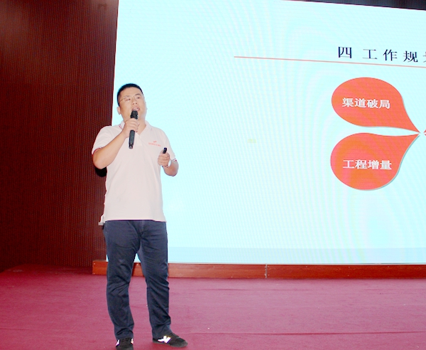 遲總用四個(gè)“心”展開了他的報(bào)告。他講到要用恒心做市場,用心做工程,以實(shí)現(xiàn)工程市場多點(diǎn)開花,工程無大小,全力爭奪。目前浙江市場是桑樂最大的空氣能市場,在工作中常與核心經(jīng)銷商溝通交流,多解決問題,通過多調(diào)研,多總結(jié),強(qiáng)推廣,多角度支持鄉(xiāng)鎮(zhèn)零售工作。