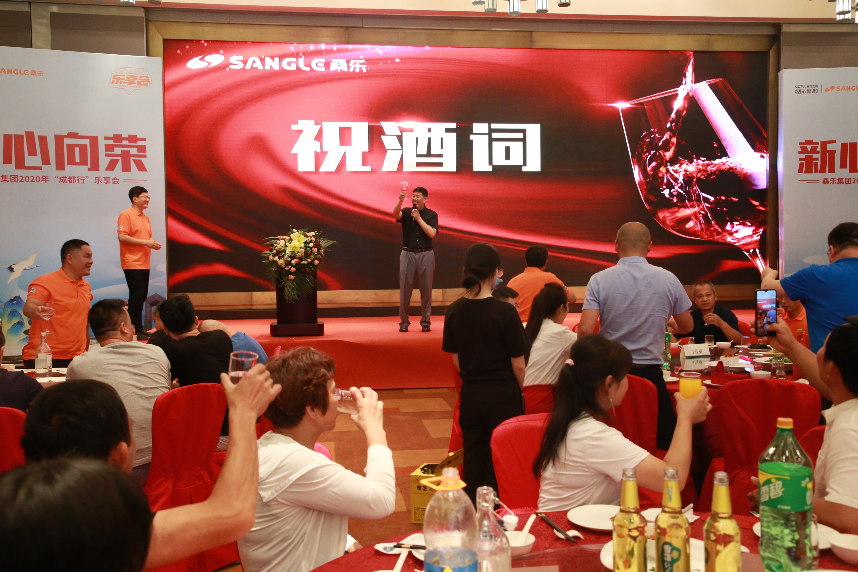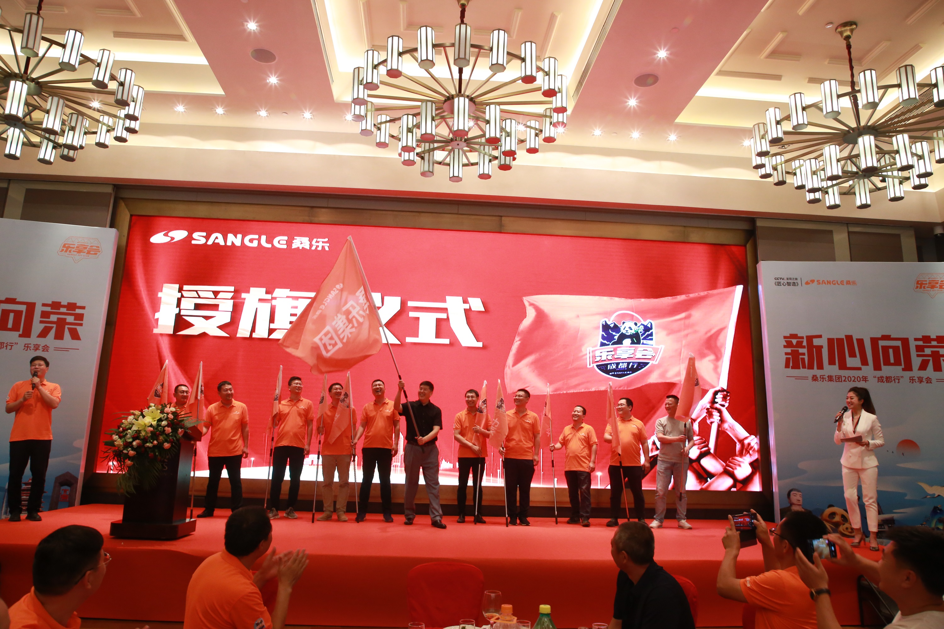 6月29日,為迎接來自各地經(jīng)銷商的到來,集團(tuán)精心準(zhǔn)備了一場盛大晚宴,大家在觥籌交錯,珍饈佳肴中,氤氳著久別重逢的喜慶氛圍。此外,現(xiàn)場還舉行了授旗儀式,董事長王雪廣親自授旗,經(jīng)銷商代表手握旗幟,在臺上揮旗飄揚,而這每一面旗幟都代表著桑樂不止所見的未來。